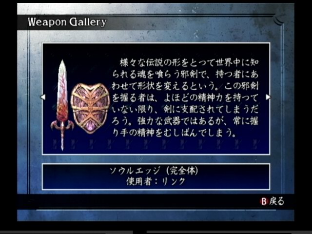 GAME INFO: A non-Zelda related item, this is the evil blade from the Soul Blade series. This is the whole reason Link is fighting, to end the resurrection and reign of the Soul Edge in Hyrule.