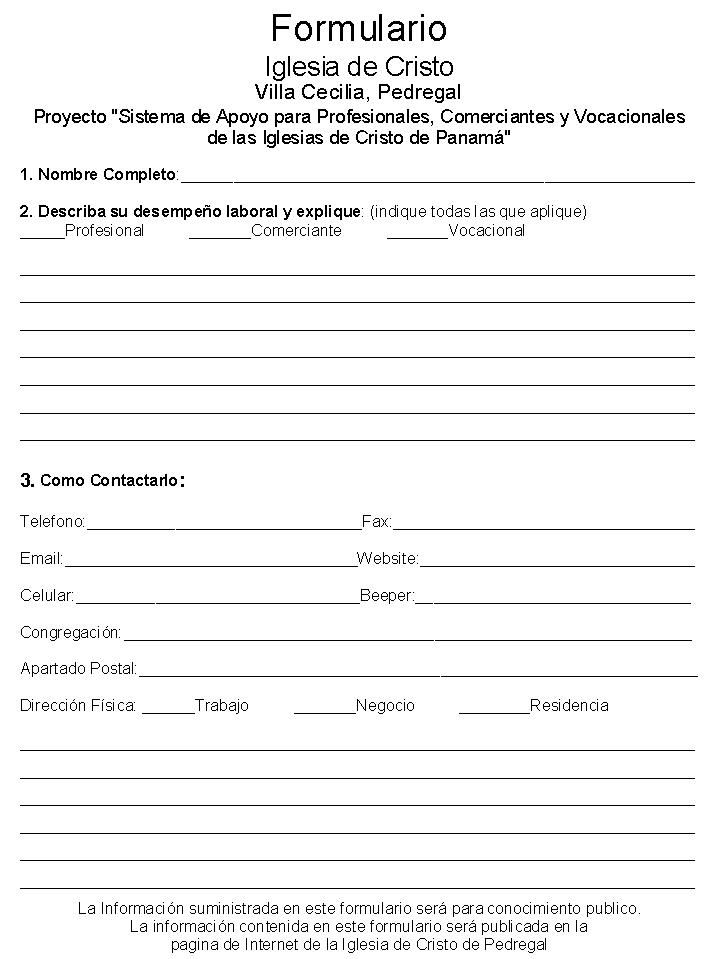 En que consiste?Consiste en la publicación de un listado de miembros de todas las congregaciones de las Iglesias de Cristo, identificando su desempeño laboral sea como Profesional (ej. Contador), Comerciante (ej. Panadero) o Vocacional (ej. Albañil). Para que sirve? Sirve para darnos a conocer profesionalemte entre todas las congregaciones; y de este modo darle prioridad y oportunidad aquellos hermanos en la fe de las iglesias de Cristo de Panamá que esten listados en la misma, cuando alguien necesite (sea miembro o no de la iglesia de Cristo) de algun servicio descrito en el listado tenga la facilidad de contactarlo y contratarlo, de la manera que mas le convenga al interesado. Cómo se puede uno suscribir a este listado? Muy fácil, solo contactenos por: (escoja la opción que más le convenga) a.) Email: [email protected] agrege su nombre desempeño laboral y la forma mas fácil de contactarlo a usted (tel,fax,email,beeper,celular,congregación, etc..). b.) Contacte a los ministros de la iglesia de Cristo de Villa Cecilia, Pedregal. c.) Baje el formulario para llenar y envielo por fax al 195-1349 o hagalo llegar a la congregación de Villa Cecilia, Pedregal. Adquiera su formulario aqui :