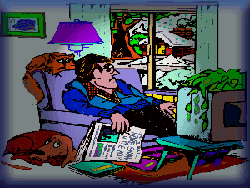 One creature was stirring, and she was cleaning the commode. The children were sleeping, all snug in their beds, While Nintendo 64 and Barbie, flipped through their heads. Good old dad was snoring in front of the TV, With a half-constructed bicycle on his knee. So only the mom heard the reindeer hooves clatter, Which made her sigh, "Now what can be the matter?" She descended the stairs, and saw the old man. He was covered with soot, which fell with a shrug. "Oh great," muttered mom, "Now I must clean the rug." "Ho-ho-ho!" cried Santa, "I'm glad you're awake." "Your gift was especially taxing to make." "Thanks, Santa, but all I want is some time alone." "Exactly!" he chuckled, "I've made you a clone." |