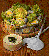 2 heads Boston lettuce 3 eggs, hard-boiled 3 herring fillets, packed in oil, drained 4 pickles 1/2 lb Saint Paulin cheese 1 tbsp green peppercorn mustard 3 tbsp vegetable oil 2/3 cup crème fraiche 2 tbsp fresh lemon juice 2 tbsp fresh chervil, chopped 2 tbsp fresh chives, chopped salt Preparation Time 20 mn