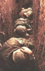 Some of the newer soldiers were huddled in a corner. They were terrified, looking nervously at the roof. One of them was crying. First time for them, considered Carter, they were just out of Basic at Rilea. He had done the same thing his first time. But he'd learned that being in a dugout was probably the safest place to be, unless of course one of the shells landed directly on the roof, a whole squad was buried that way about 12 months ago.