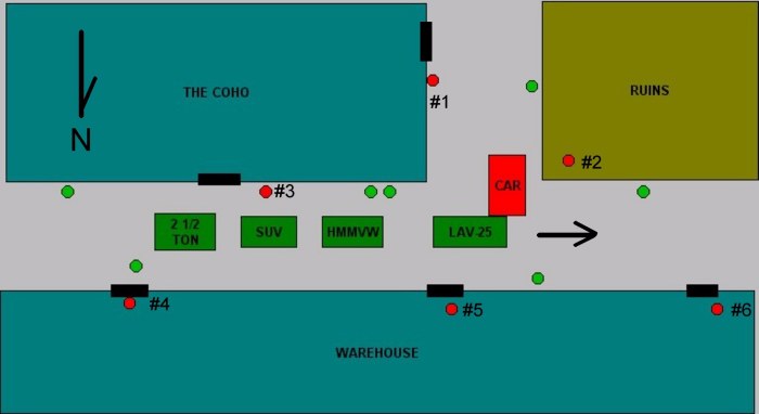 ![]() Note: Red dots indicate enemy positions, Green dots are friendlies. Arrow indicates direction of travel. N indicates North.