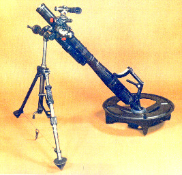 ![]() 82mm Vasilek: Standard medium mortar for the Warsaw Pact, the Vasilek is a clip-fed automatic mortar. May not be disassembled, but is provided with a detachable wheeled carriage to allow it to be towed behind a vehicle. The mortar may not be fired from its carriage. Requires 12 combat turns to set up. Wt: 80 kg (carriage weighs 50 kg), Mag: 5, Price: $20,000 (R/S).