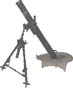 ![]() 81mm: Standard medium mortar for most western armies. It can be disassembled into three loads (bipod, baseplate, tube) for easier transportation. Individual rounds are dropped down the tube by the loader. Requires 6 combat turns to set up. Wt: 40 kg (bipod 15 kg, baseplate 10 kg, tube 15 kg). Price: $10,000 (C/S).
