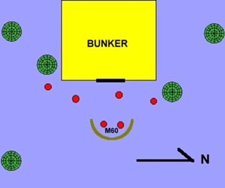 ![]() LEGEND: Red dots are enemy soldiers, Green circles are trees, and friendly troops are coming in from the East (Bottom of the picture).