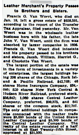 "Hotel Buckingham, 5th Avenue and 50th St. Mr Van Woert was connected with his father, the late John V. Van Woert, in the leather business until the company was absorbed by the United States Leather Company. He was born on Broome St. on January 19, 1841."