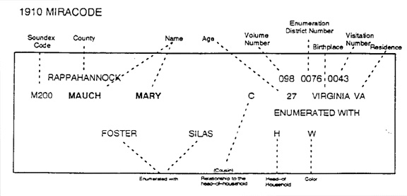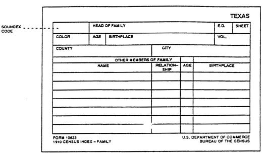 The 1910 Soundex-coded census is in a different format from the 1880 and 1900 censuses. Computer-entered cards are shown in the microfilm, rather than handwritten ones as in other years. An advantage is that the computer type is unambiguous as compared to the hundreds of different styles of handwriting in the Soundex. A disadvantage is that it shows less information than the soundex cards. In any case, the advantages of any index weigh most favorably in research since they lead to entries in the census.