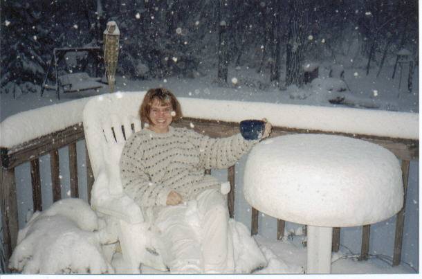 Here's connie enjoying a hot beverage on our deck. You can clearly