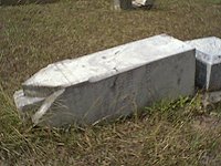 The first time I ever heard of Major Doran was through an E-mail request from Warren Hataway, a Texas History teacher in College Station, TX. He was asking for my assistance in finding the grave of a W. P. Doran who he thought was probably buried in Hempstead. I looked it up in the Waller County Cemetery book and sent an approximate location for that section in the Hempstead Cemetery. A second E-mail said he couldn't find the grave and ask for better directions. The next day my wife and I drove over to the cemetery and by finding grave stones that were near Doran's in the book, we discovered Major Doran's grave. We also discovered why Mr. Hataway missed it. The approximately 4 foot high, 1 foot square marble shaft (weighing hundreds of pounds) commemorating a Confederate Civil War veteran had been vandalized and turned over, face down. No, not fell, pushed over. The base was still square and level. |