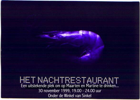 29 November: Voor familie en getuigen 13.30 uur Huwelijk in de Soetesalon, Paushuize, Pausdam Utrecht Voor verdere informatie: zie de uitnodiging 30 November Feest!! Van 19.00-24.00 uur Locatie: 'Het Nachtrestaurant', onder de Winkel van Sinkel, Oudegracht Utrecht (ingang aan de Werf) | |||||||||||||||||||