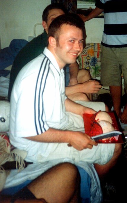 4. Paul Cusick known as - "Quince" or "Quincy" I said that both Pauls were known by surname, but Cusick got misheard at first as "Quincy". He studies business with Chris (well at least he is enrolled on the course!). He is probably the best organiser of the group and so became the chief negotiator with Keylet, the people we got the house from. He's apparently a devout catholic but I've not seen him go to church yet. Mind you, most people don't actually even get up on a Sunday morning. He is a big fan of Watford FC. |