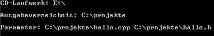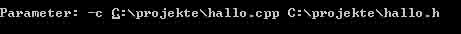 Als "Parameter" folgt nun die eigendliche Angabe der Quelltexte sowie eigener Header-Dateien (Die Standartheaders werden von CD automatisch geladen). Sollten sich die Quelltexte nicht im Compilerverzeichnis befinden, muss der Pfad mit angegeben werden.