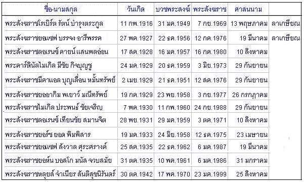 | สังฆมณฑลราชบุรี มีพระคุณเจ้า ยอห์นบอสโก มนัส จวบสมัย เป็นพระสังฆราช สังฆมณฑลจันทบุรี มีพระคุณเจ้า ลอเรนซ์ เทียนชัย สมานจิต เป็นพระสังฆราช สังฆมณฑลเชียงใหม่ มีพระคุณเจ้า ยอแซฟ สังวาล ศุระศรางค์ เป็นพระสังฆราช สังฆมณฑลนครสวรรค์ มีพระคุณเจ้า หลุยส์ จำเนียร สันติสุขนิรันดร์ เป็นพระสังฆราช สังฆมณฑลสุราษฎร์ธานี มีพระคุณเจ้า ไมเคิล ประพนธ์ ชัยเจริญ เป็นพระสังฆราช สังฆมณฑลท่าแร่-หนองแสง มีพระคุณเจ้า ลอเรนซ์ คายน์ แสนพลอ่อน เป็นพระสังฆราช สังฆมณฑลอุบลราชธานี มีพระคุณเจ้า มีคาแอล บุญเลื่อน หมั้นทรัพย์ เป็นพระสังฆราช สังฆมณฑลอุดรธานี มีพระคุณเจ้า ยอร์ช ยอด พิมพิสาร เป็นพระสังฆราช และสังฆมณฑลนครราชสีมา มีพระคุณเจ้า ยออากิม พเยาว์ มณีทรัพย์ เป็นพระสังฆราช |