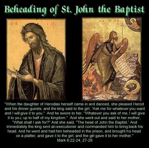 กษัตริย์เฮโรด ผู้รับนางเฮโรเดียส ภรรยาฟีลิปน้องชายของตน มาเป็นภรรยา ได้ใช้คนไปจับยอห์นล่ามโซ่และขังคุกไว้ เหตุเพราะ ยอห์นเคยทูลเฮโรด ว่า "ท่านไม่มีสิทธิ์รับภรรยาของน้องมาเป็นภรรยาของตน" และนางเฮโรเดียส ผูกพยาบาทยอห์นปรารถนาจะฆ่าเสีย แต่ยังฆ่าไม่ได้เพราะ เฮโรด ยำเกรงยอห์นด้วยรู้ว่าเป็นคนชอบธรรมและบริสุทธิ์ เมื่อถึงวันเกิดของกษัตริย์เฮโรด ได้จัดเลี้ยงฉลองอย่างยิ่งใหญ่ บุตรีของนางเฮโรเดียสเข้ามาเต้นรำ ทำให้กษัตริย์เฮโรดและ แขกทั้งปวงชอบใจ เฮโรดจึงตรัสแก่หญิงสาวนั้นว่า "เธอจะขอสิ่งใดก็จะให้สิ่งนั้นจนถึงกึ่งราชสมบัติ" หญิงนั้นจึงถามมารดาว่าจะขอสิ่งใดดี มารดาจึงตอบว่า "จงขอศีรษะยอห์นผู้ให้รับบัพติศมาเถิด" หญิงสาวจึงรีบทูลกษัตริย์เฮโรดว่า "หม่อมฉันขอศีรษะยอห์นผู้ให้รับบัพติศมา ใส่ถาดมาให้ดิฉันเดี๋ยวนี้เพคะ" กษัตริย์เฮโรดทรงเป็นทุกข์นัก แต่เพราะเหตุได้ปฎิญาณไว้และเห็นแก่หน้าแขก ก็ขัดไม่ได้ จึงรับสั่งให้เพชรฆาตไปตัดศีรษะ ยอห์นในคุก ใส่ถาดให้แก่หญิงสาวนั้น และหญิงสาวนั้นก็นำมาให้มารดาของตน เมื่อศิษย์ของยอห์นรู้เหตุแล้ว ก็พากันมารับศพของท่าน ไปฝังไว้ในอุโมงค์