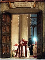 ของพระสันตะปาปาองค์ก่อน ผู้ซึ่งได้เปิดประตูศักดิ์สิทธิ์ ตราของพระสันตะปาปาปิโอที่ 12 และปอลที่ 6 อยู่ใต้แผ่นกรุบานประตูที่ 9