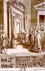 พระคาร์ดินัลสององค์คุกเข่าอยู่ข้างๆพระองค์ ผู้ที่ถือเทียนอยู่ในมือ คือ พระคาร์ดินัลมอนตินิ ต่อมาท่านได้เป็นพระสังฆราชประจำเมืองมิลาน และดำรงตำแหน่ง พระสันตะปาปาปอลที่ 6 สืบต่อจากพระสันตะปาปายอห์นที่ 23 ทหารรักษาพระองค์ชาวสวิสยืนอยู่ข้างประตู คำจารึกภาษาลาติน ซึ่งคัดมาจากหนังสือเล่มสุดท้ายของ พระคัมภีร์ เกี่ยวกับการทำนายเหตุการณ์ต่างๆที่จะเกิดขึ้นก่อนโลกสิ้นพิภพ อ่านว่า "เรายืนที่ประตู และเคาะ" ภายในพระมหาวิหาร มีรูปภาพลวดลายโมเสอิค อันสวยงาม ของนักบุญเปโตรถือกุญแจเมืองสวรรค์ และคำจารึกเป็นเกียรติแด่พระสันตะปาปาเคลมเม้นท์ที่ 10 และปีศักดิ์สิทธิ์ 1675