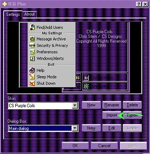 new skin, begin with When you click on this button you will be presented with a window that will allow you to search your hard drive for the skinz file you wish to install. Though in most cases the file will be in a Zip format, there is no need to unzip the file yourself as ICQ plus does this for you automatically. It will also create a separate directory for your skinz and place all the needed files in this directory. Once the name of your new skinz appears in the ICQ Plus menu, hit the apply button to apply this skinz to all the options of ICQ and ICQ Plus. |