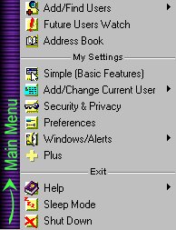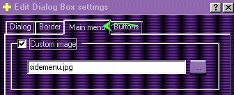 The Main Menu: Is where you will choose the image to be displayed on the small side menu on your ICQ. I have found that a good all around size for this image is 25 x 255 It is also a good idea to fill this image with your pattern, as I found that when the image was a small image, it did not fill the entire height of the menu. |