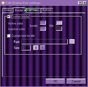 The Border: The border is the upper area of your ICQ and ICQ Plus console. In the image to the left it is the part above the tabs which reads Edit Dialog Box Settings. On ICQ it's self, it is the part that displays your number etc. The Active Color is the color the menu will appear when the selection is active or in use and the Inactive is the color it will appear when the program is up but dormant. To start select custom border: The color you choose for your tittle is the color your text will appear on your borders. You can also choose the type of font you want your heading to appear in, and the point size etc |