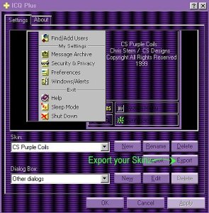 Once you have completed your skinz theme, you can share them with others by exporting them to a zip file. Exporting your own Skinz is easy. Just select the Export button on your ICQ Plus Menu. |