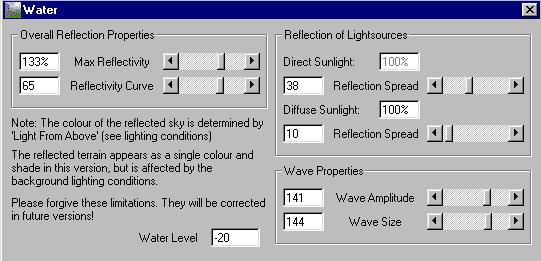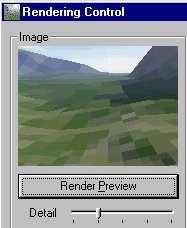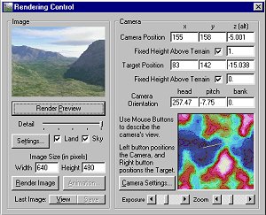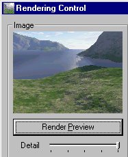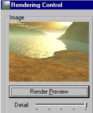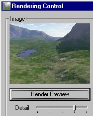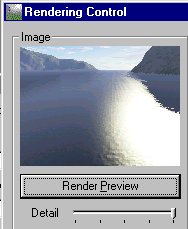 Planetside Terragen - Scenery Generator is a terrain generator that will create very realistic landscape scenes, based on your mathematical input. Being a landscape painter from way back, I knew it was only a matter of time before I gave this program a try. After only a few hours I knew I was hooked, and although I found it easy to generate land it was a little more difficult to achieve a water scene. I wrote this tutorial for the benefit of those that want to create water scenes and need a better understanding of the theory behind achieving this. The first thing you will have to do is generate or load a pre-existing terrain. If you have not already generated a sky, you will want to do this next. After these two steps are completed you can choose your camera and target position The render control menu will allow you to see any changes you might make, or to display your final rendering before saving it to a bmp file. Sliding the detail slider to the right will give you the best quality although it will taker longer to render. Obviously the finest detail, is the best option to see exactly what your finished scene will look like. The lowest quality because of it's fast rendering is useful for checking out minor changes such as sun position, camera angle changes etc.