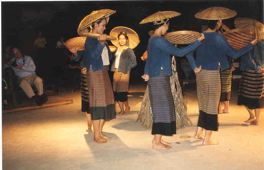 The hilltribe dancewere outside and consisted many elaborate costumes and wierd musical instruments.