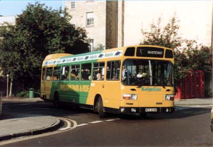 August 1991 saw me in Bath and Wells to ride on Badgerline's wonderful remaining RE's. Captured on film leaving the bus station in Bath was Leyland National NFB 604R.