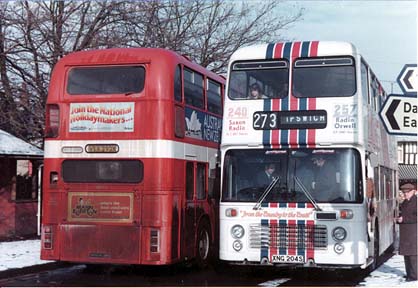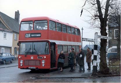 Seen when only a few months old in January 1980 is VR 243 (JAH 243V), which took over from VR 207 as the regular bus used by Ipswich to work route 204 to Bury St Edmunds. She is pictured here collecting passengers at Woolpit.