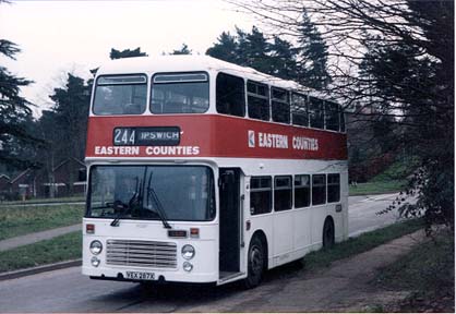 In dual-purpose livery is VR 287 (VEX 287X), seen here on 22nd December 1984 in Bredfield road, Woodbridge, working route 244.
