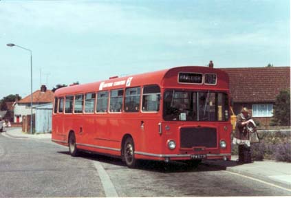 Wearing the all-over red livery applied to single-deck buses in the early 1980's is Ipswich based RL 677 (PPW 677F), collecting passengers at Hadleigh in Suffolk in June 1981 before returning home.