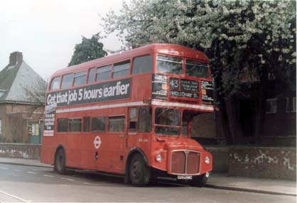 Muswell Hill's RML 2298 (CUV 298C) is pictured on the long-since closed Goldsmith road stand at Friern Barnet on route 43 in 1987.