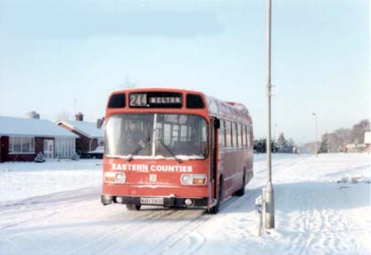 Allocated to the out-station at Woodbridge on 5 January 1985 was Eastern Counties Leyland National, LN 593 (WAH 593S), pictured at Kesgrave on route 244 heading for Melton.