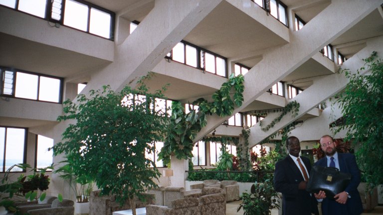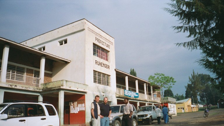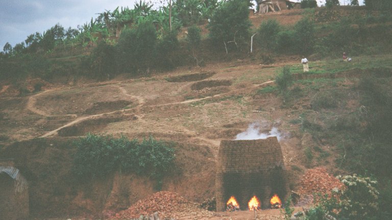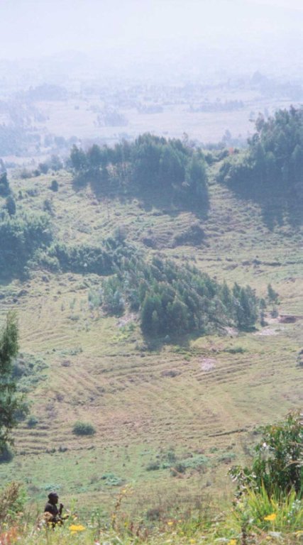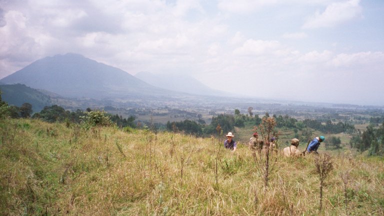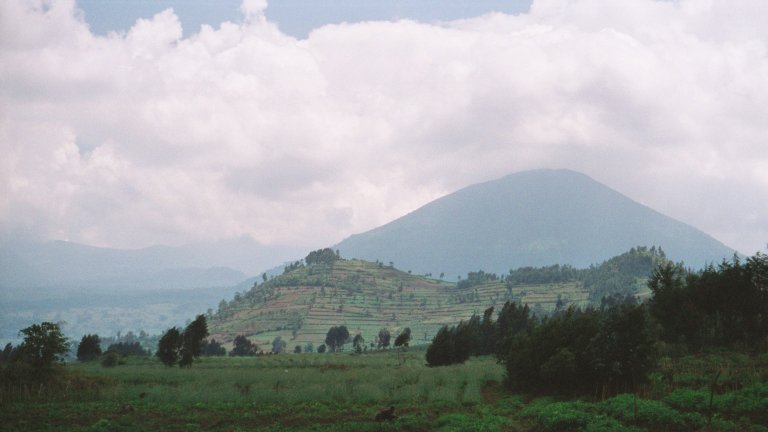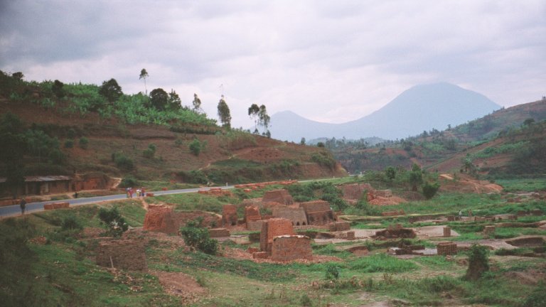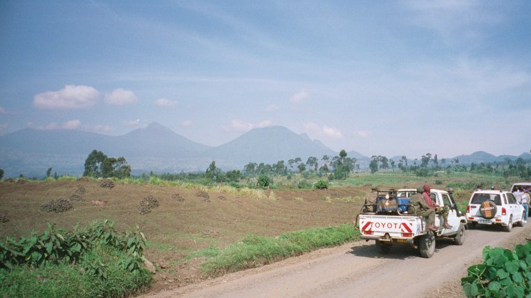 On Saturday, August 21, after getting security clearance from the UN offices in New York and Kigali the previous day, we rose at 5AM - a feat made difficult the previous night not so much by the late meeting we had with the mission chief, in which we assured him that for a day off we would complete a specific volume of work by the end of the weekend, as by the rhythmic drum celebration that took place by the swimming pool at our hotel, vibrating the panes of our glass balcony doors until after midnight. In town we met our military escort of four armed soldiers who would ride with us as far as Ruhengeri, the town closest to the volcano on whose slopes the gorillas live. We loaded into two four-wheel drive RVs for the ninety minute drive, during which we followed our soldiers, who sat on benches facing sideways on the back of a Toyota pickup truck, which, perhaps for security reasons or perhaps to recognize the importance of the IMF mission and the government authorities who accompanied us, led us at speeds of up to a hundred miles an hour, as we passed through beautiful steep terrain whose cultivated plots made quilt patterns on the sides of the green hills. We passed thousands of people of all ages on their way to regional markets, carrying huge baskets, bags, and wooden objects on their heads. About a third of the people carried tomatoes, while others carried bananas, sugarcane, yams, manioc root, firewood, and wood tables. We passed by 20-foot-high, smoky pyramids of mud bricks with fires built underneath to cook them in the middle of the marshy fields that they had been carved out of.