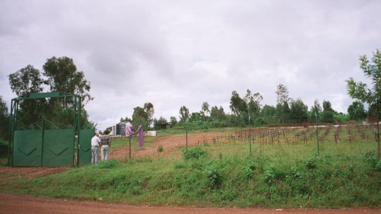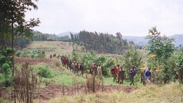 At about 9:00 - after stopping at the prefecture in Ruhengeri to get our final papers and because we had to wait for the return of our guides, who had gone out ahead of us to scout out where the gorillas were that morning - we drove up a hill to a one-room outpost where the full military escort that would accompany us on the final leg of the journey up the side of the volcano to the gorillas' habitat had assembled. It included 20 soldiers carrying machetes, automatic rifles with multiple clips and tripods, and rocket launchers. Most looked like teenagers, including the boy who carried the rockets, who looked like he was sixteen. When I asked him if I could take his picture he walked away without saying anything. We noticed that it was much cooler there than in Kigali. We were told that we might want to put on shirts with long sleeves both for warmth and to protect us from the vegetation along the paths.