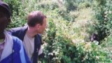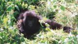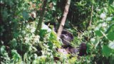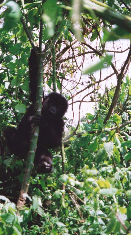 At 10:30, as we came into an area with scattered trees and thick bushes, the lead guide motioned to us to stop and be quiet. He and the other guides began making low, purring grunts while standing on their toes and peering into the bushes. Our group pressed together as we all wanted to be close enough to him see the gorillas, but far enough behind him to be safe. Twenty feet in front of us we saw the bushes shake violently. We were told to crouch down and be silent and we waited in this position for several minutes. An aggressive grunt came from the bushes a few feet away and, startled, we recoiled and got set to retreat, but the guides indicated that we should stay down. After another minute, during which the guides continued to call to the gorillas, the lead guide motioned to us to move forward a few feet. Pushing down the bushes in front of us, he revealed a baby gorilla hanging from a branch, about seven meters away, staring at us like a human toddler seeing TV for the first time. Although he was only six months old, he was strong enough to do flips while holding onto branches with both hands. As we quietly shifted about to take pictures and give everyone a look, the mother raised her head into sight; it was tipped back and her expression was relaxed, as though she were reclining on her favorite sofa.