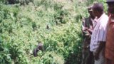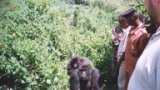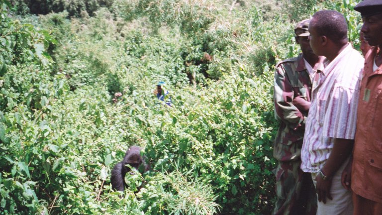 As we squeezed together and milled about in the confined area to see, the guide at the rear of our group suddenly called out to us all to step aside. Following urgent signs from our guides, we spread out into a single line, economists, officials, guides, and soldiers, and leaned back against the bushes along the left side of the path. As we stood like this at attention, perhaps twenty of us, with our backs straight and our stomachs sucked in, like infantry being inspected by a general on horseback, the mother gorilla came up the path behind us with her baby on her back. Giving no indication that she noticed a difference between the ferns to her right and the human legs to her left, she passed alongside us, joining her companion that we had been watching in the bushes in front of us.