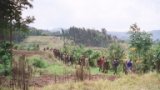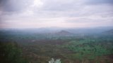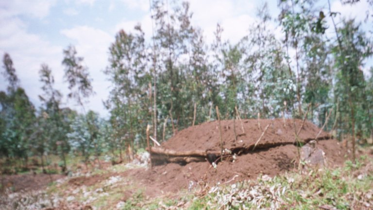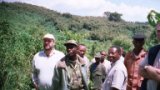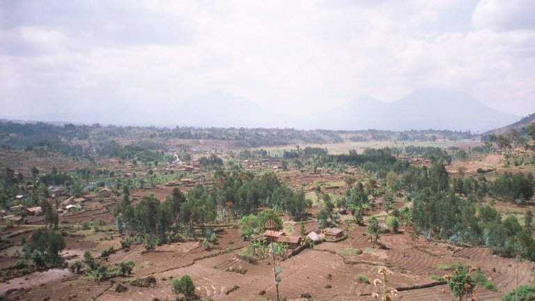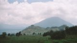 We continued up a rough, rocky path to the foot of the volcano, from which we had views of the surrounding mountains and other volcanoes. All were completely covered by forest, even though the highest peak reached 4,507 meters. Around us we saw good land that was not being cultivated, including some that we knew had been abandoned because we could see traces of plowed rows. Below us, towards the town, we could see new, solidly-built, mud-brick houses with tin roofs that had been provided to people displaced in 1994, as well as some previously-existing, mud-and-stick shelters that had been fortified with trademark blue, United Nations High Commission for Refugees, plastic sheets.