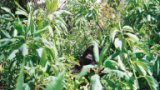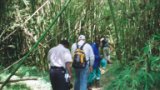At 9:30 we started hiking into the forest, which varied from thick bushes and ferns, to dark bamboo forest without undergrowth, to open field, to heavy forest with undergrowth so dense that in places we had to crawl on our hands and knees to pass under creeping vines and tangled branches. Many of the ferns had stinging needles that would leave an uncomfortable, tingling itch for up to 30 minutes. I had the misfortune at one point to firmly grab the stem of one when I lost my balance. The needles were fine and would easily slip through cloth, so our pants and long shirts gave only minimal protection. There were vines along the ground that would catch your feet and you would trip and fall if you were not careful, as happened to the boy carrying the rockets while he was walking directly in front of me.