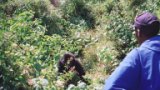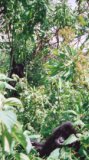 At this point we could tell from their receding noises and from the movements of the bushes farther down the path that the gorillas were moving away from us, so we followed them. We were no longer walking on ground, but on a mat of leaves and vines several feet thick. If you stepped carelessly onto a soft spot you would fall through up to your hip. In some places you could hold onto a vine or branch for support, but in many places these were too low to be of use or were covered with needles. We moved slowly for a couple of hundred yards, as the guides grunted and sniffed the air, and came to a narrow path that ended in front of a cluster of tall bushes. A long vine that one of us was holding onto began moving, rapidly disappearing into these bushes. Inside them, we saw an adult gorilla; staring at us, eating the vine, shifting about, and periodically beating his chest at us.