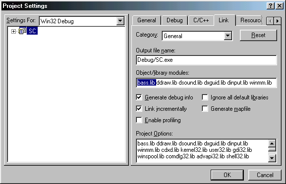 | Goto Project/Settings, then click on the links tab and add bass.lib as shown below... | |