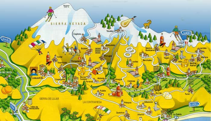 Este fue el primer año en que la esencia de los Torres se embarcó en las vacaciones de largo recorrido. Desembarcamos en el maravilloso pueblo granadino de Bubión en el corazón de la alpujarra granadina y Sierra Nevada. Bubión junto con Pampaneira y Capileira tres típicos pueblos alpujarreños que se encuentran encaramados en el Barranco de Poqueira, por el cual transcurre el rio que le da su nombre Poqueira. La Villa de Bubión está situada a 1.296 m. de altitud, aunque Capileira es el más alto de estos tres pueblos. En Capileira podemos encontrar una pista forestal que se adentra en la montaña para llegar a las cotas más altas de la sierra, se puede llegar desde aquí hasta el Pico Veleta y el Mulhacén. Si nos encaminamos en dirección a Trevélez por el camino surge Pórtugos donde podemos encontrar la famosa Fuente Agría, que a través de sus cinco caños brota agua ferruginosa, junto a la fuente está la cascada del Chorreón. Continuando nuestro viaje a la parte derecha de la carretera se encuentra Busquistar, un bonito pueblo alpujarreño que servirá de prolegomeno al pueblo de Trevélez, que es uno de los pueblos más altos de España. aproximadamente a unos 1.476 m. de altitud, esta situado en las faldas del Mulhacén ( 3.481 m.), pico más alto de la Península. Si al emprender nuestra ruta nos dirigimos a la parte mas occidental encontraremos Órgiva que tiene el papel de capital administrativa de la comarca. Y por último Lanjarón que se considerá la puerta occidental de Las Alpujarras, importante por la calidad de sus aguas medicinales.