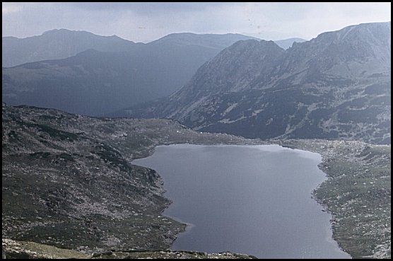 Looking down on Retezat's largest glacial lake, tents are visible in the camping area on the far side.