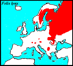 | The Lynx (Felis lynx) is restricted to steep mountainous terrain over 700 metres and it requires very large hunting areas. Consequently it lives at low population densities and is especially vulnerable to environmental change.