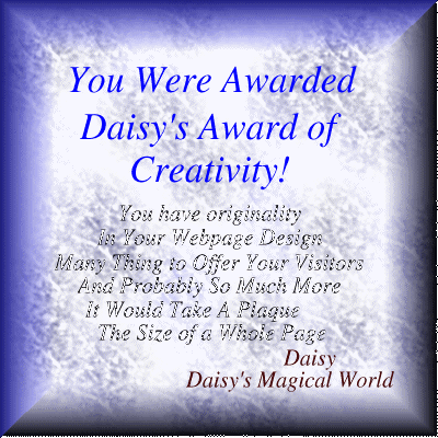 If your site meets these standards, or even exceeds them, I'd be honoured to present my award to you. I ask that you do not "steal" the awards from my page and only take them if I send them to you saying that you have won it.