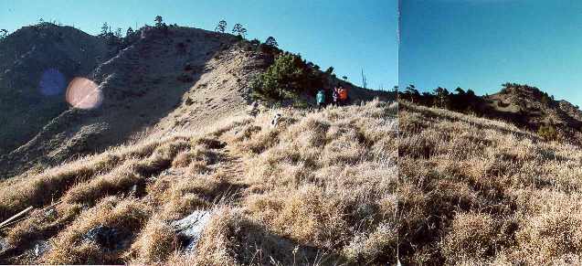 哭坡是最滯礙難行的一段,許多體力不繼的山友在此掛了,包括小組長和我的女友,於是就走在隊伍的最後面.每挺升幾公尺,就停下來休息片刻,喘口氣,再繼續振作,安步當車.哭坡後是幾個假山頭,一路上上下下. |