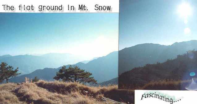 After walking through the supple, thick, and flat Wu-Lin Ranch, you observe a sea of clouds beginning to form beneath your feet. On the top of Crying Slope, there are no tall and straight trees to impede the field of vision. Looking down at mountains, you suddenly feel the profile of mountains is wild, rugged, and erratic. Deep inside, pines, cypresses and junipers are growing densely and luxuriant shrubs are on the ground. Even today, the original Mt. Snow is not hard to imagine. True, this wide landscape is presumed to be one hundred percent the same as thousands of years ago. |