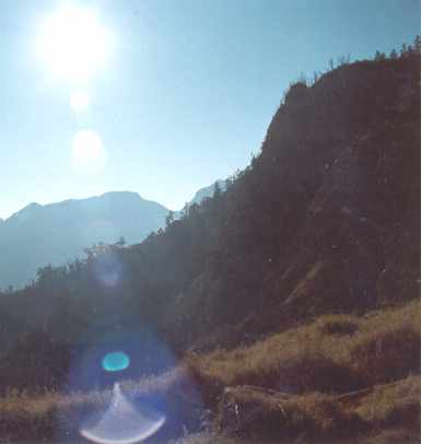 走不多時,隔個山谷眺望,穆特勒布山顯得格外綺麗動人.我們想著,到遠方旅行,以找尋精神與肉體上的重生與復甦的渴望,並不只是單純橫越大山的念頭。崇山峻嶺符合了人類向高處挑戰的夢想,探索地表奧秘的想法。 |