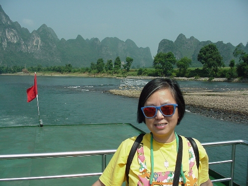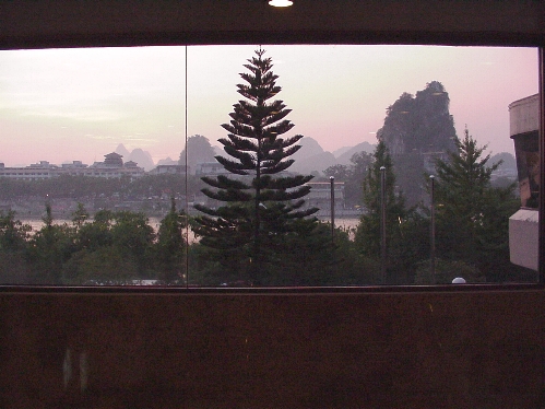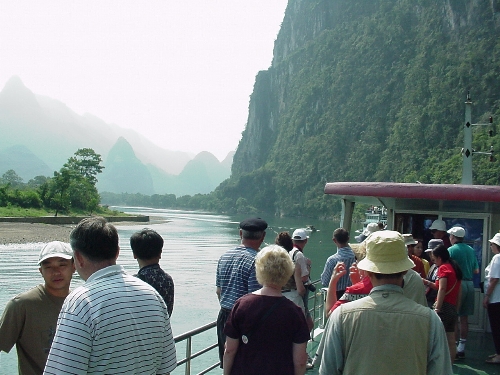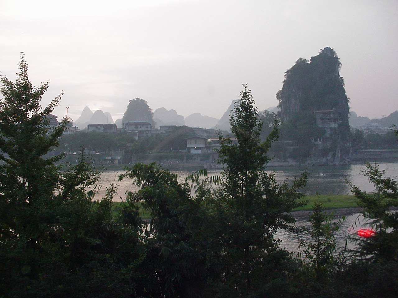 That's an island in the Li River, and those little dots are kids swimming around the island.