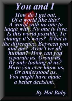 Note:If you would like to take this poem to show that you're against racism... be my guest. That would make me very happy to see that people care. I ask you to not copy my words and say you wrote it. I know that probably doesn't happen very often... but I really like this poem I wrote and I would like to have some credit for it. If you want to use it, you don't have to email me though. All you have to do is take it. Please do not link it to this site as I will change the name from time to time.