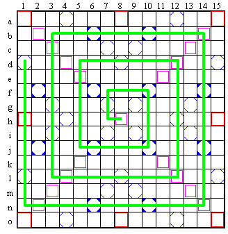 Choisissez une des 4 spirales ci-dessus et recouvrez de mots son trajet marqu� en vert, tout en respectant les r�gles g�n�rales du jeu de scrabble. Le trajet de la spirale peut �tre parcouru en entier (si vous utilisez toutes les lettres du stock) ou en partie. La valeur des �ventuelles lettres non plac�es ne sera pas retir�e de votre total.